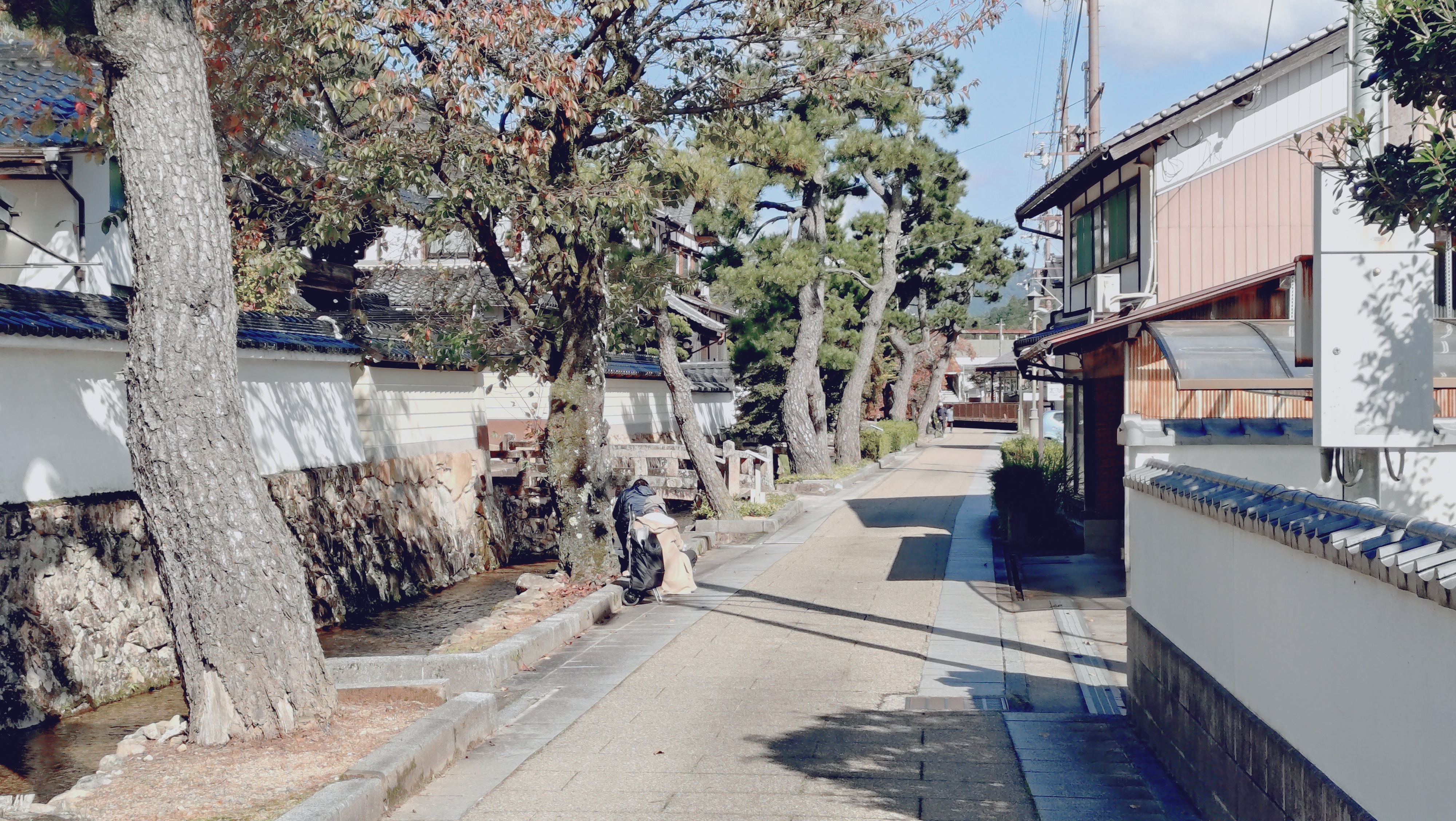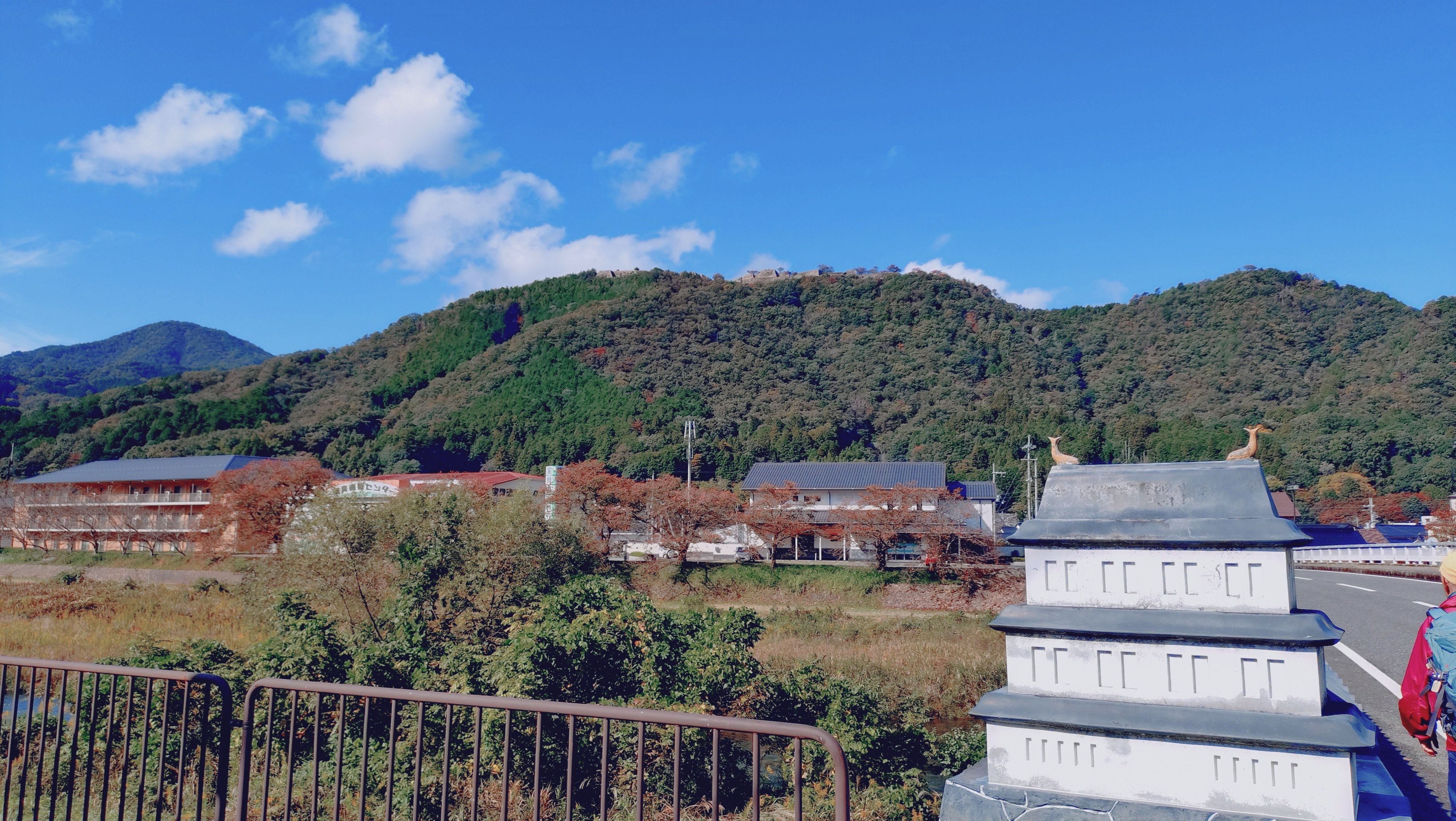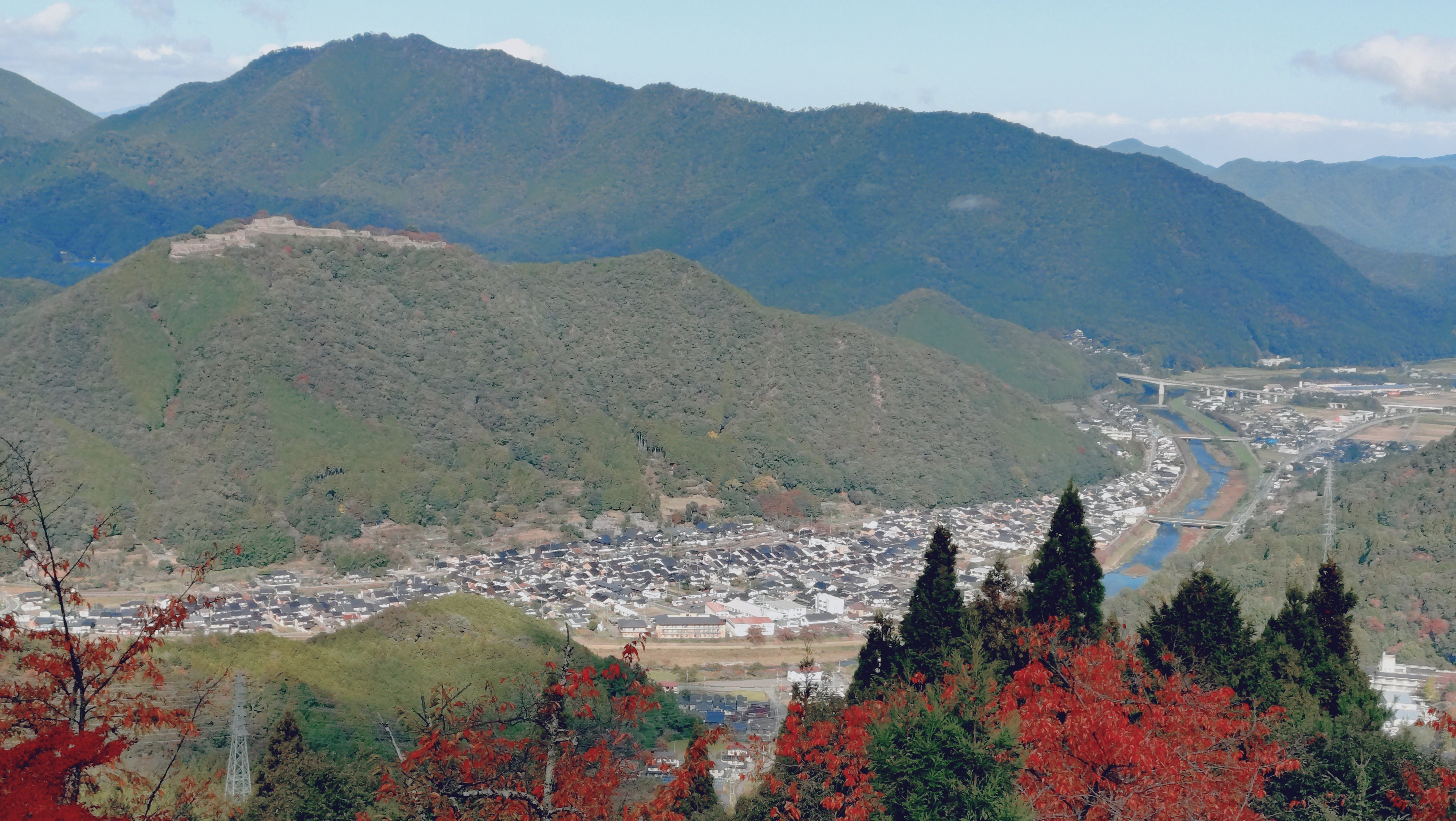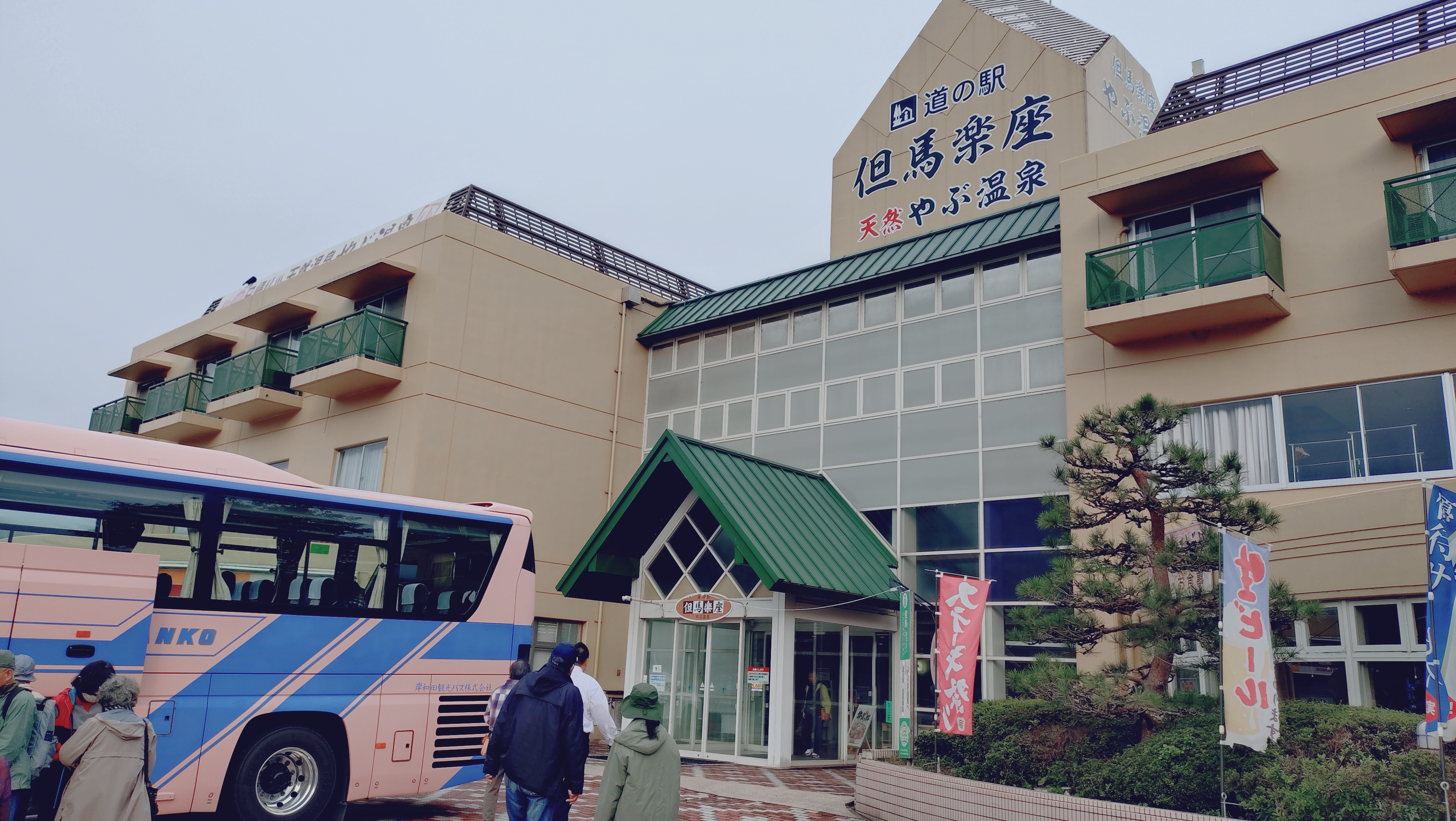 お宿の但馬楽座前で集合写真を撮ってから、竹田城下に出発です。