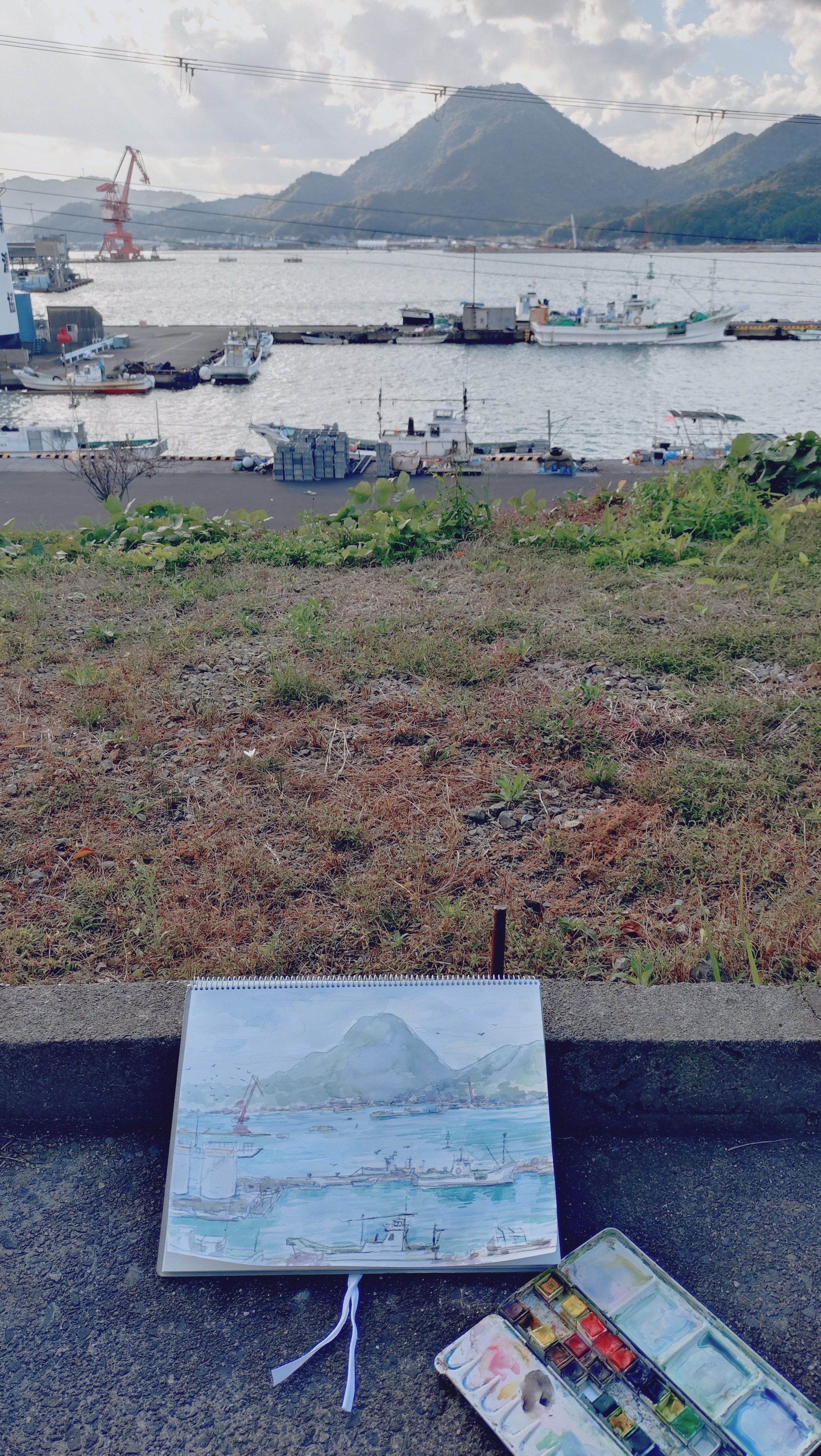 私はちょっと高台の場所から、富士山に似たお山を描くことにしました。