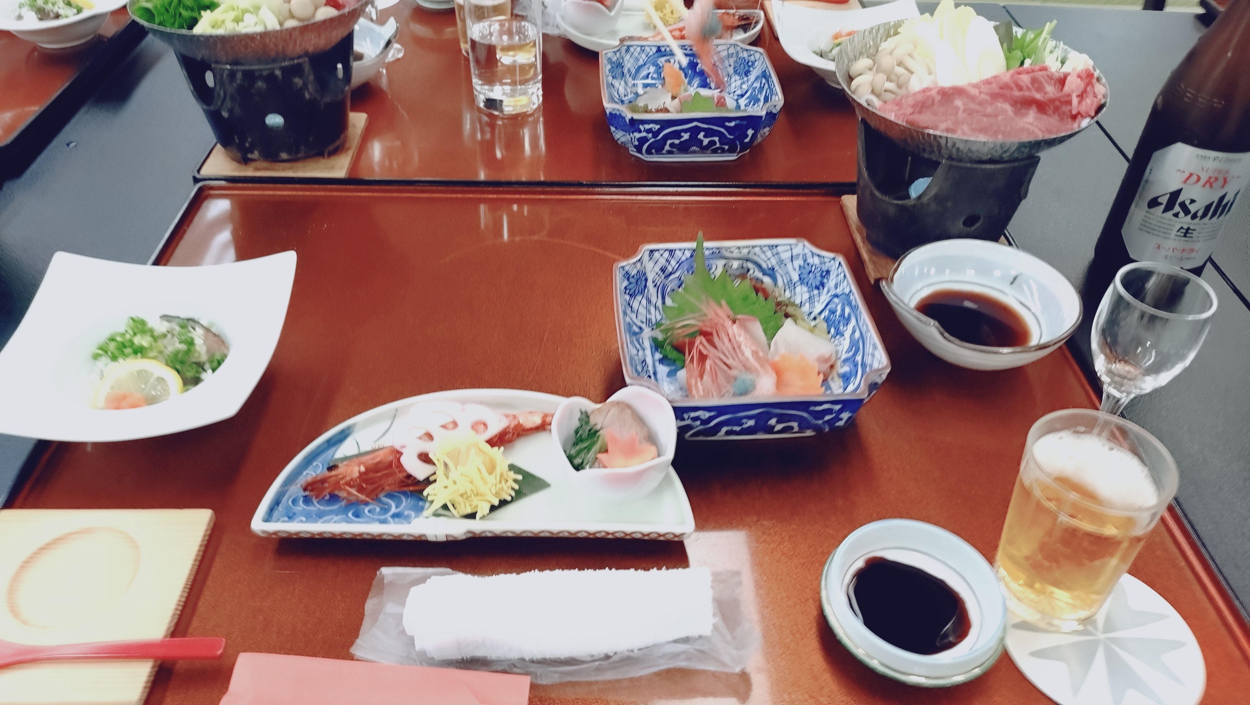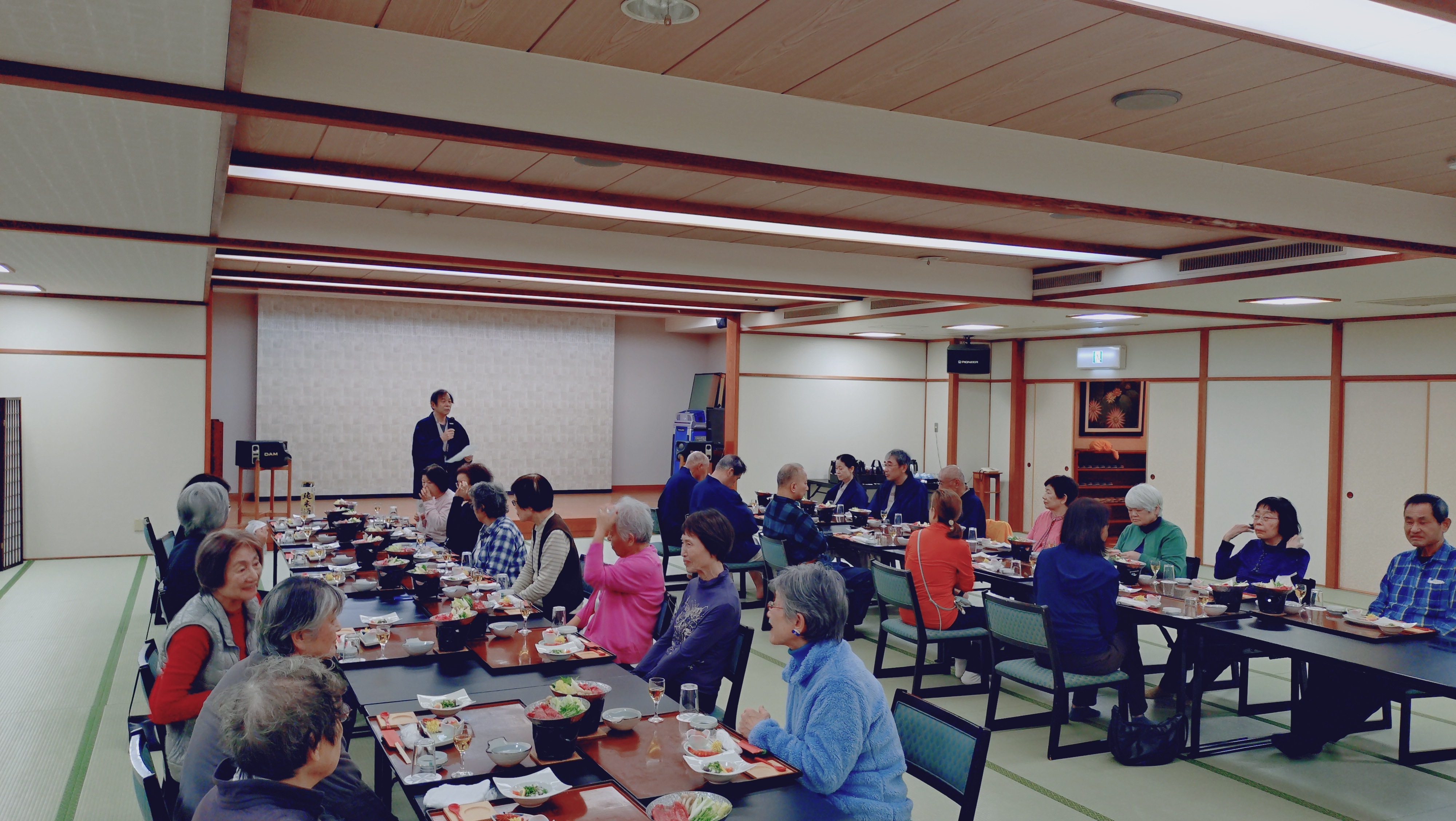 さっと温泉に浸かってから、宴会場で夕食を食べ、事務局長たちの部屋にて希望者のみの講評会を開催。